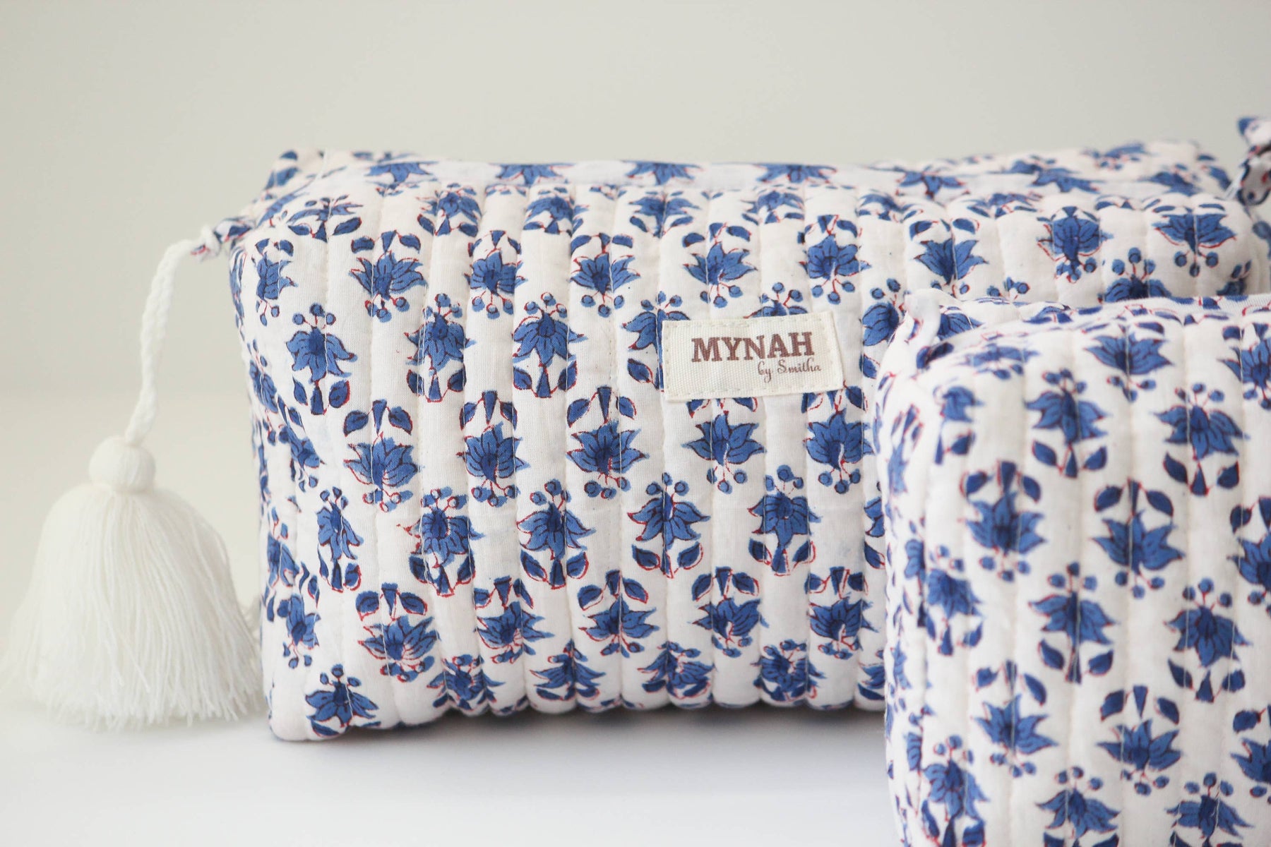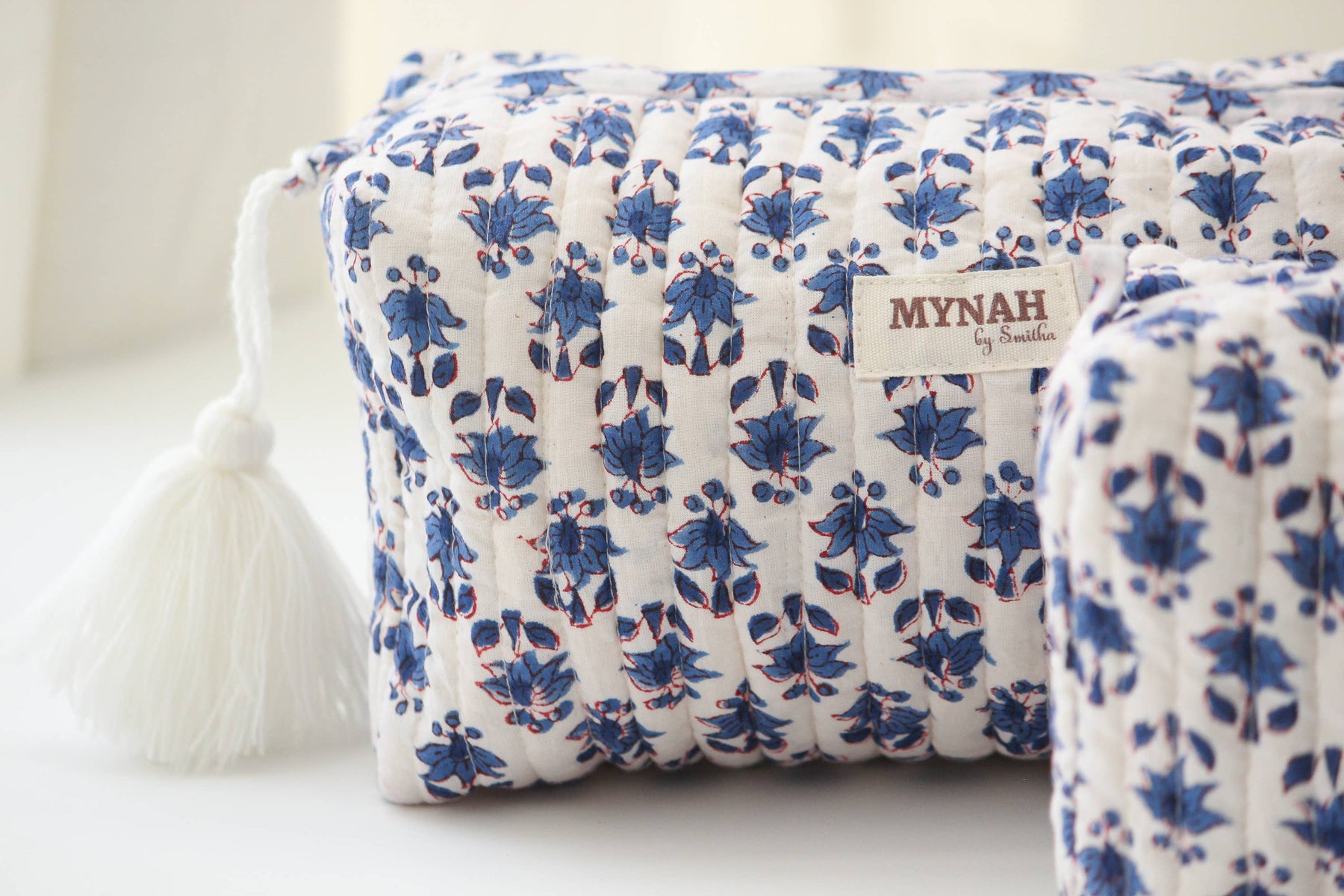 Gorgeous hand block printed quilted travel bag. SINGLE large pouch only - Large pouch is 10”x 4.5”x 4” Makes an amazing gift! Waterproof Lining: Designed for practicality, our travel bag comes with a waterproof lining, ensuring that your belongings remain protected from unexpected spills or the elements. Travel confidently, knowing your essentials are shielded from moisture. Machine Washable and Tumble Dry: Enjoy the convenience of easy maintenance.