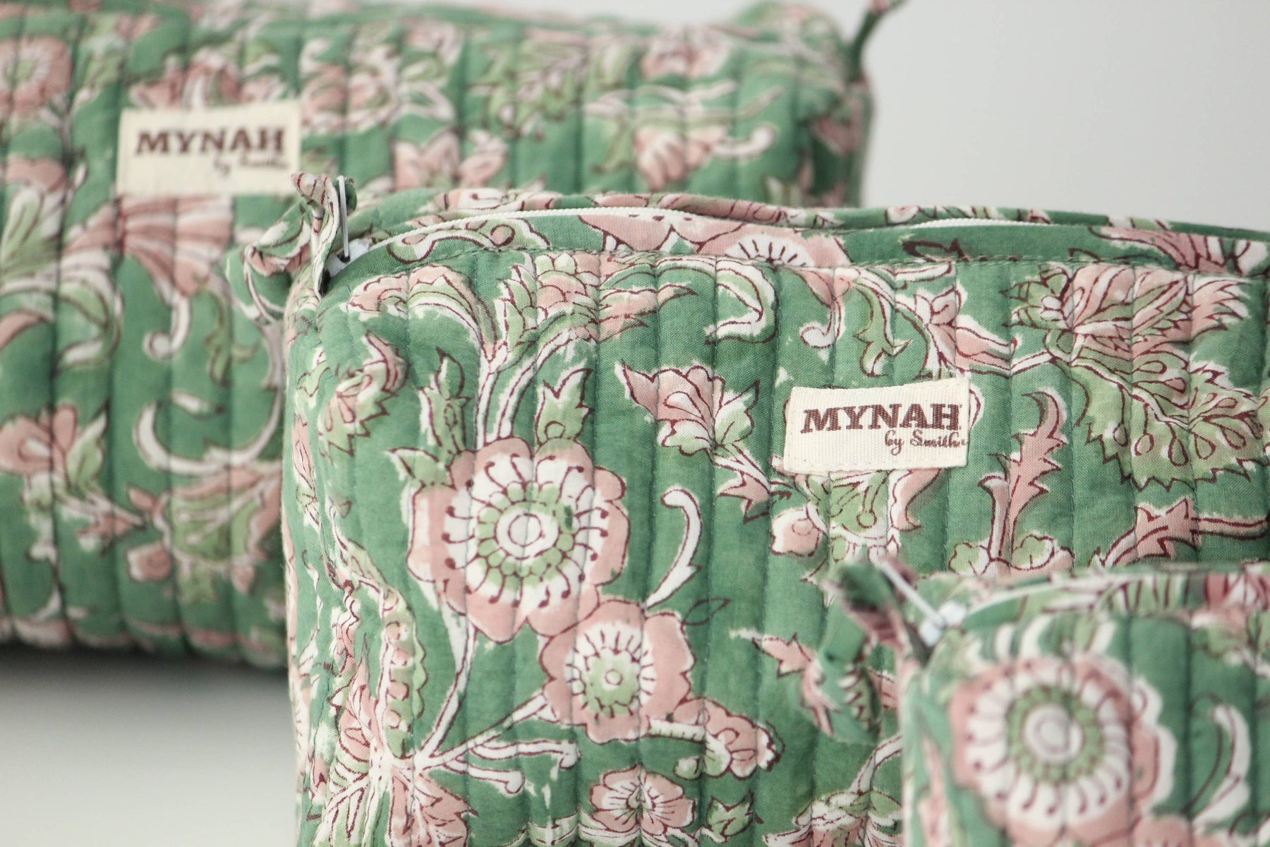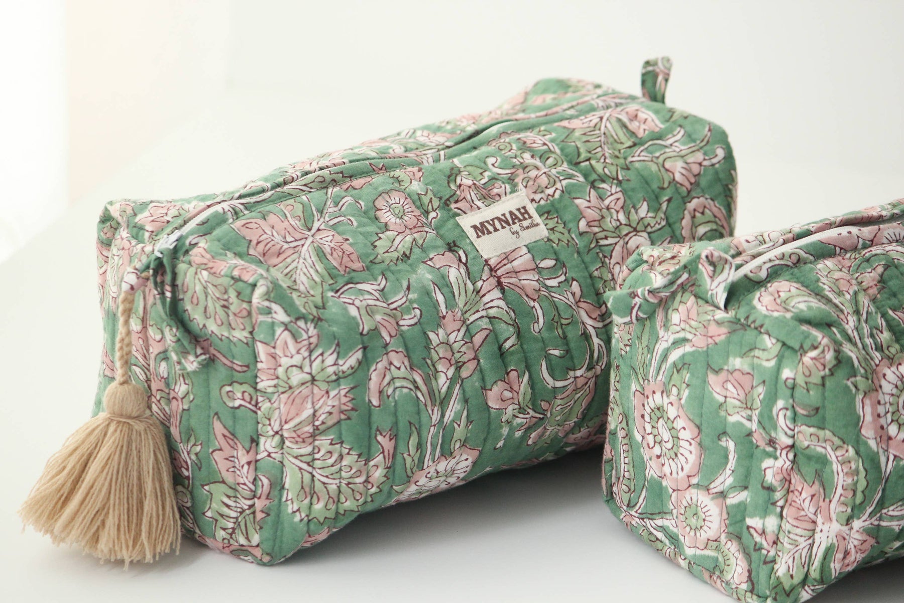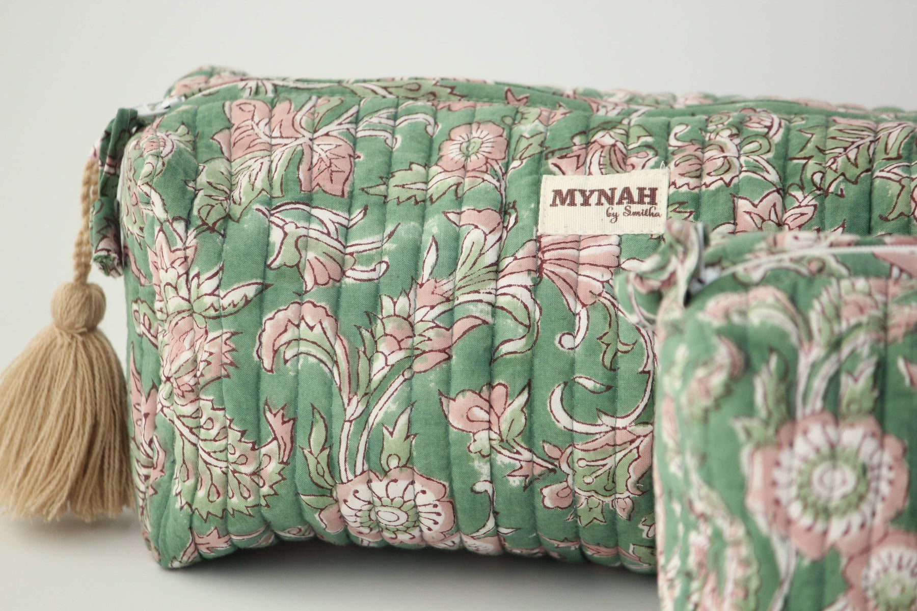 Gorgeous hand block printed quilted travel bag. This listing is for one LARGE pouch only - Large pouch is 10”x 4.5”x 4” Makes an amazing gift!