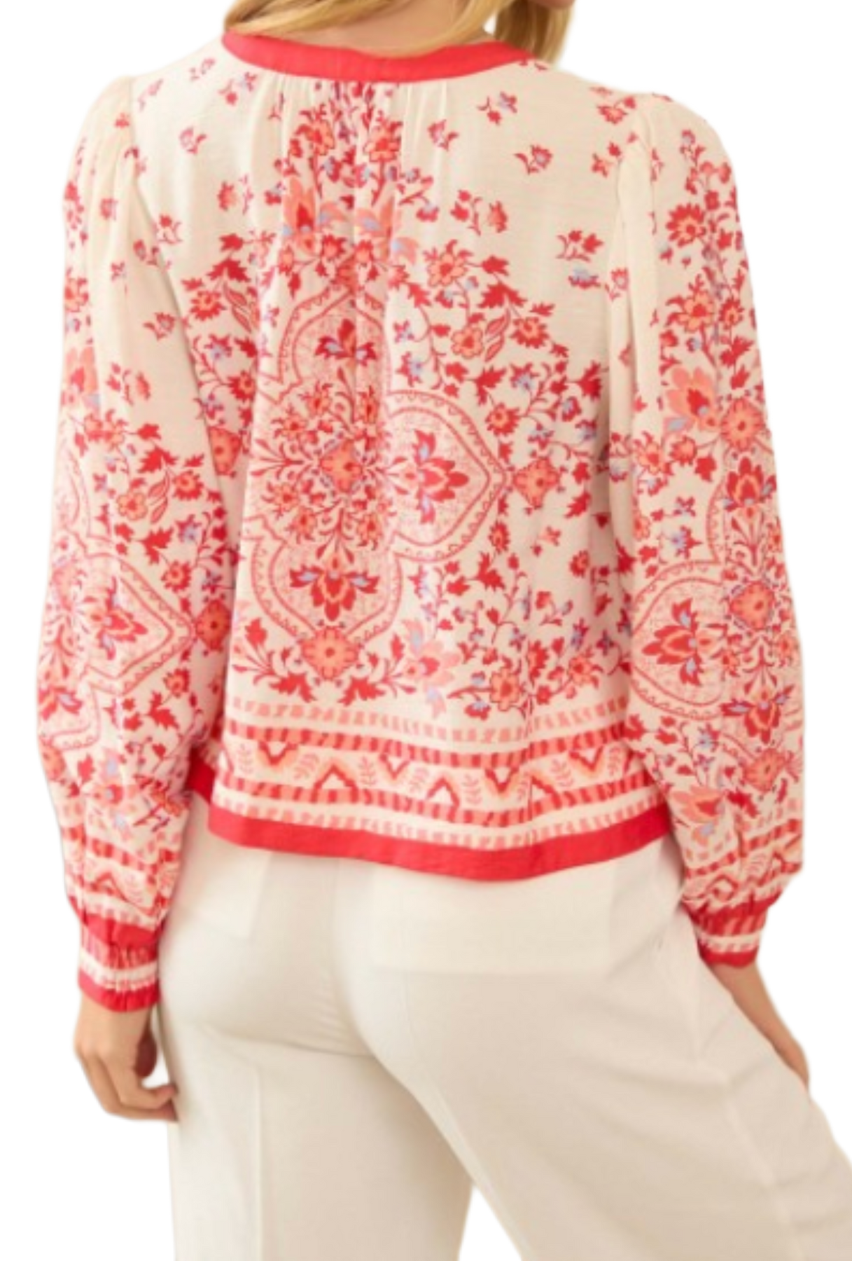 Fresh, feminine, and full of detail — this red and ivory printed blouse is an instant statement piece. Designed with a softly structured silhouette, it features a flattering split neckline with contrast trim, intricate floral-inspired print throughout, and beautifully placed border detailing along the hem and cuffs. The long sleeves are finished with subtle elastic cuffs for an easy, comfortable fit, while the slightly cropped shape pairs perfectly with high-rise denim or tailored trousers.