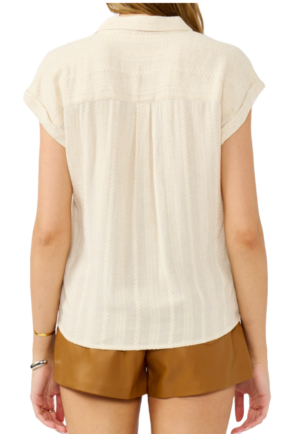 Light, airy, and effortlessly chic, this textured blouse is the perfect blend of relaxed comfort and polished style. Designed with a soft, lightweight fabric, this top features subtle vertical textured detailing that adds dimension and visual interest. The collared neckline and flattering V-front create a refined yet easygoing silhouette, while the cap sleeves enhance its breezy, feminine feel. Finished with a gently gathered hem for a slightly blouson fit, this versatile top pairs beautifully with denim, trousers, or skirts for an effortlessly elevated everyday look.