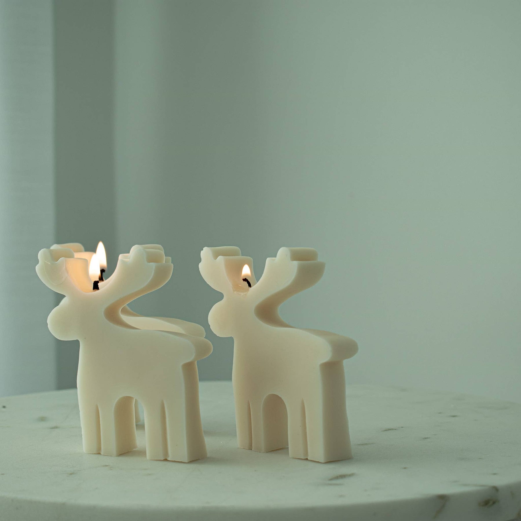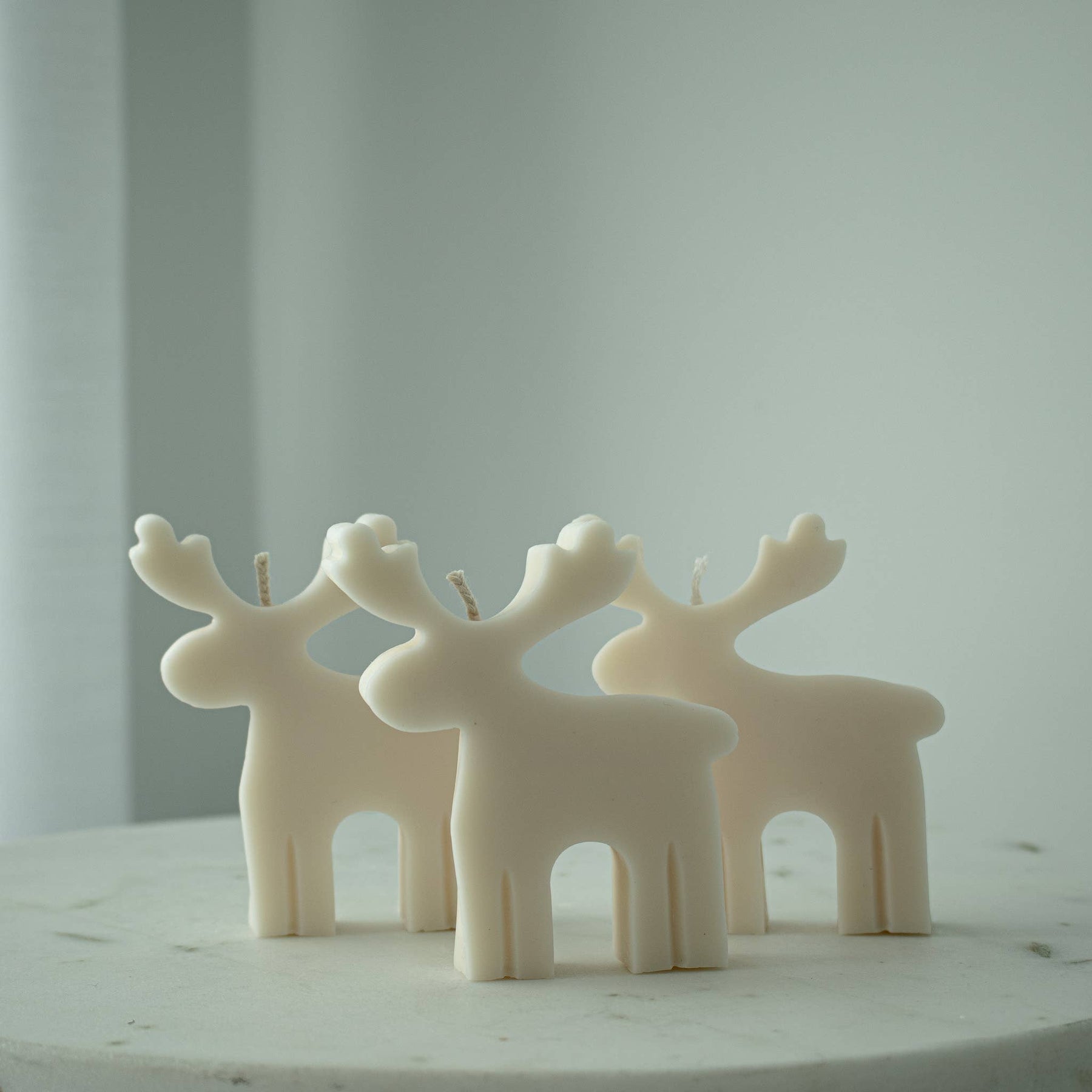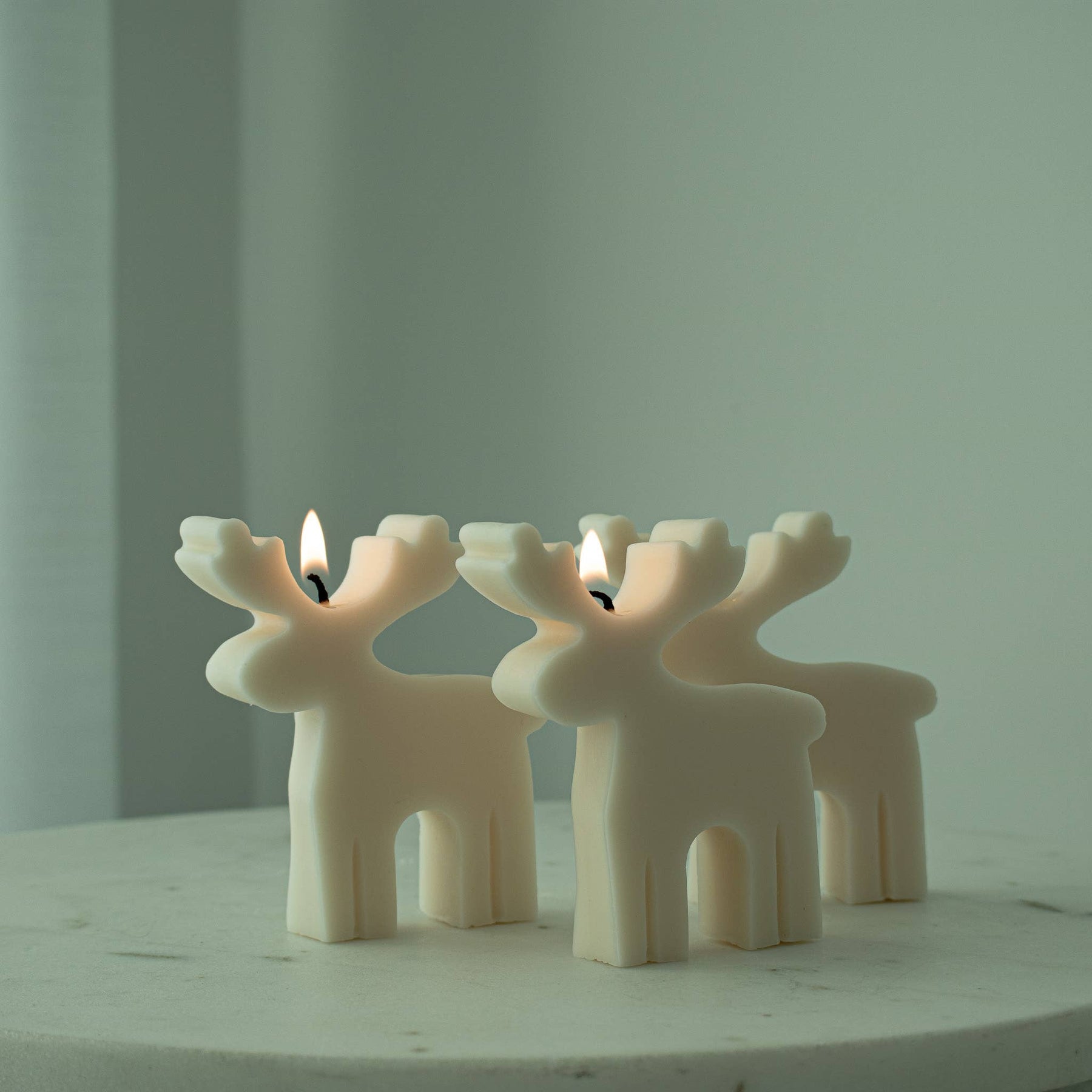 SOLD INDIVIDUALLY. A charming reindeer-shaped candle that adds a cozy, woodland-inspired touch to any winter or holiday display.  Hand-poured in small batches using natural soy wax and cotton wicks, each candle reflects our commitment to quality and care. Woman-owned, proudly made in the USA. We craft with intention-clean ingredients, mindful production, and a whole lot of heart. Dimensions: 4" H x 3 1/2" L Unscented. Burn time: 1 hr.