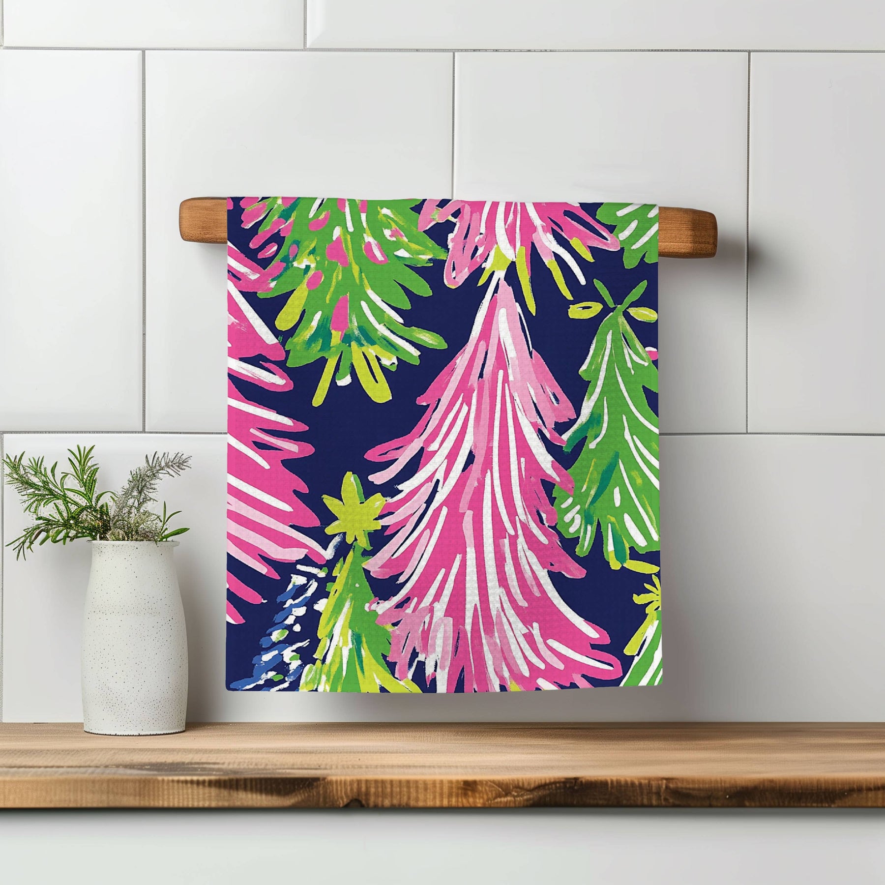 Preppy Navy Pink Chinoiserie Christmas Kitchen Towel Lime