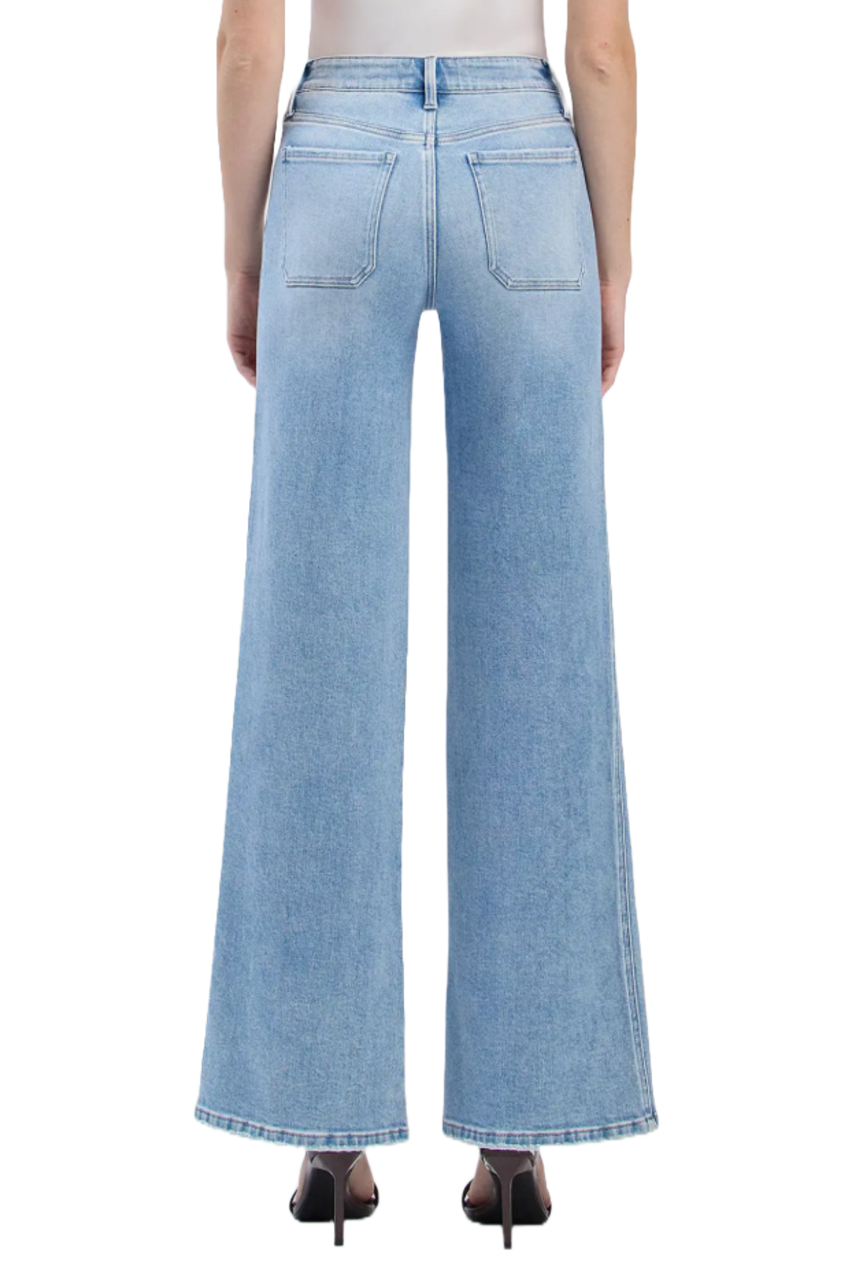 Comfort stretch denim, high rise waist, patch pocket detail, finished hem, full length, wide leg jeans