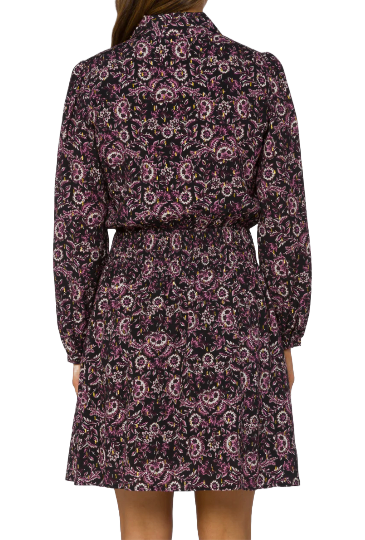 long sleeve mini dress features a smocked waist, soft drape and finished with delicate metallic lurex thread for a hint of shine