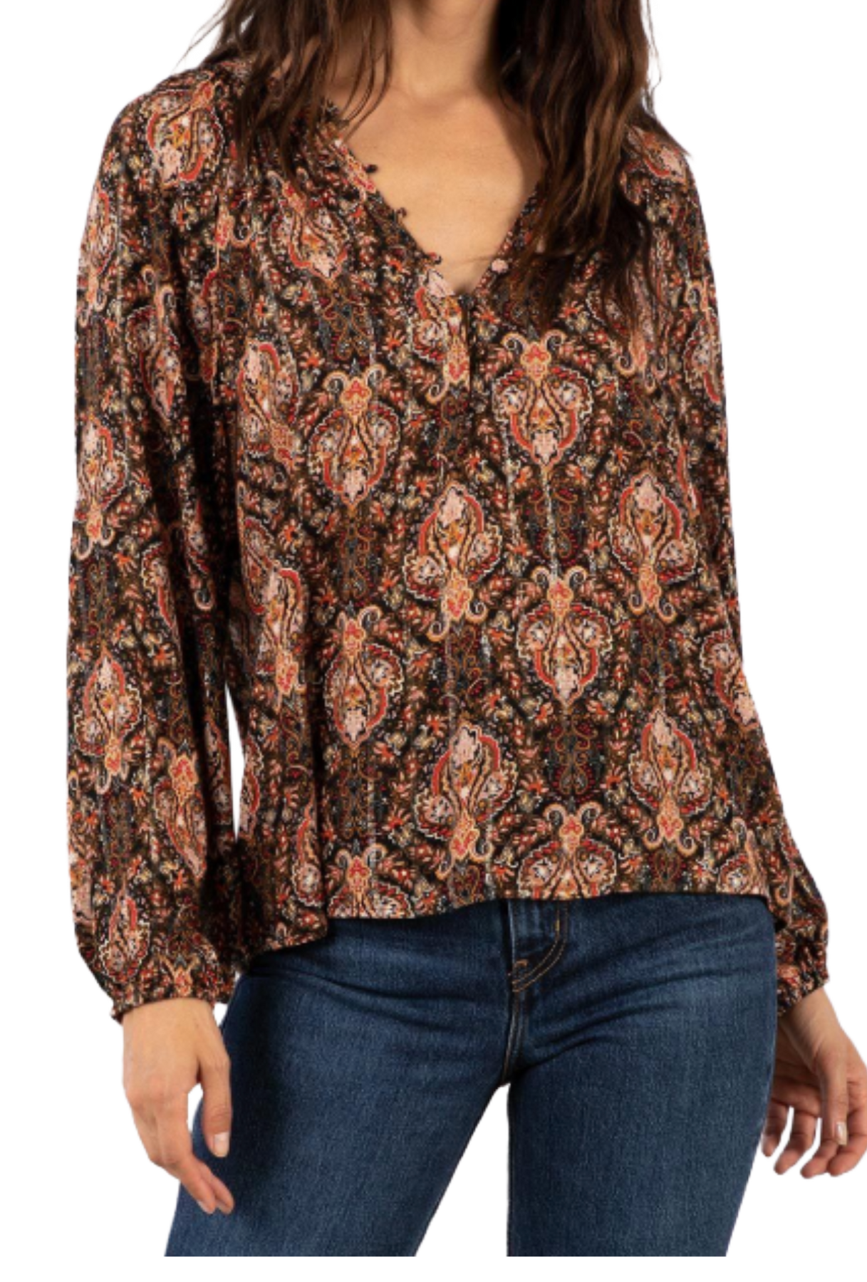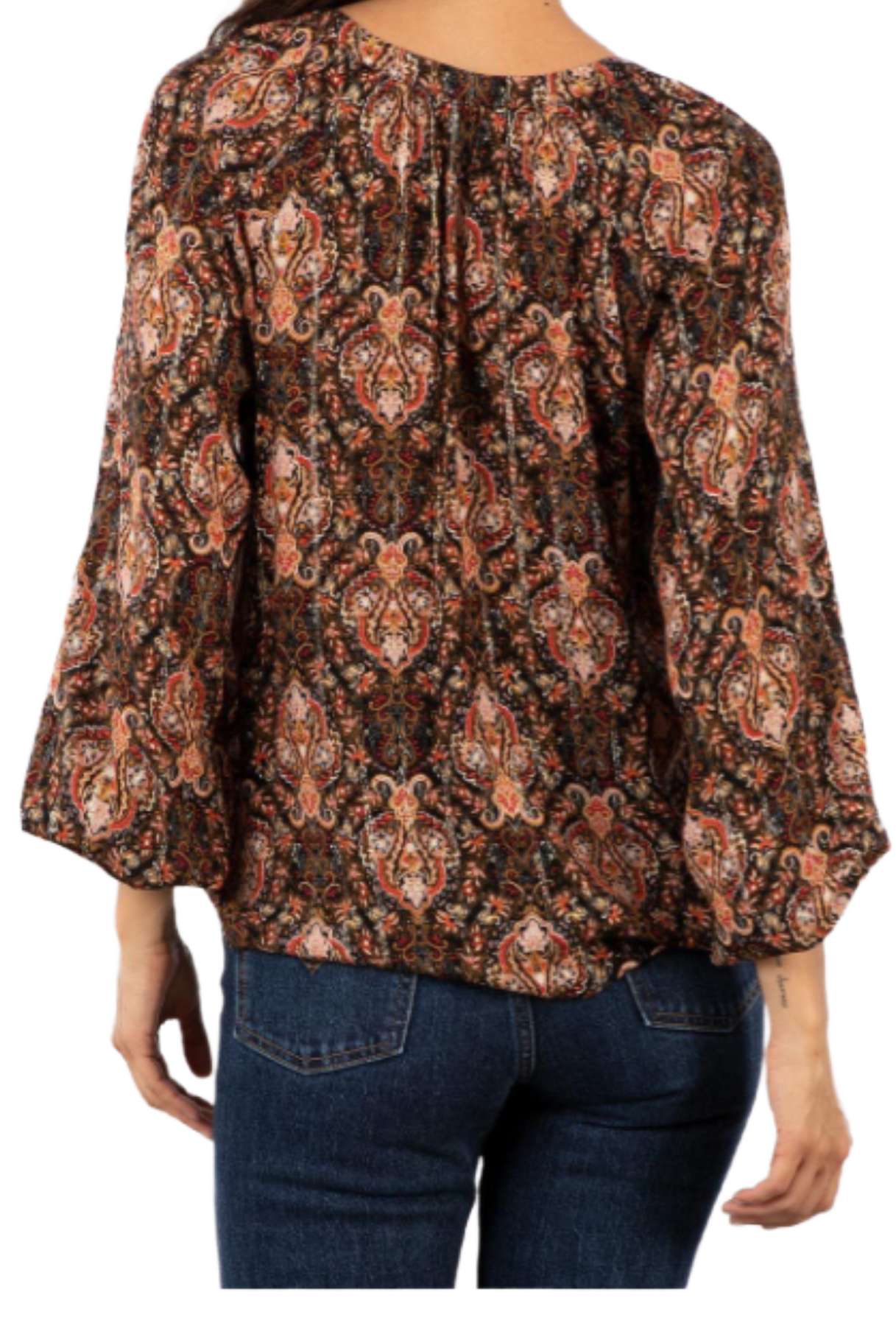 This effortlessly chic peasant top features an allover paisley print accented with subtle gold lurex threads for a touch of shimmer. Designed with a relaxed, easy fit, it showcases a button loop–trimmed V-neckline with self-covered loop buttons down the front. Long, voluminous sleeves with elastic cuffs add soft movement, while the hip-length silhouette makes it perfect for styling tucked or untucked. A timeless boho staple that transitions seamlessly from day to night.