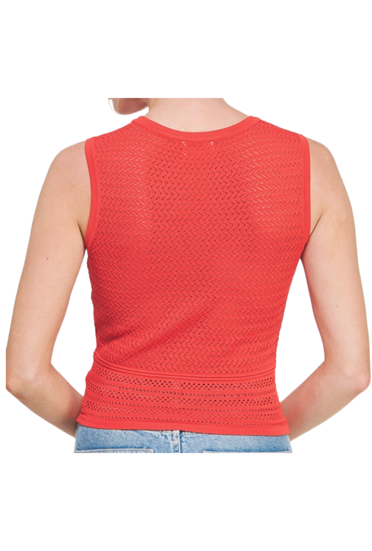 A bold, textured knit top designed to make a statement. Featuring an intricate open-knit pattern with a flattering, body-hugging fit, this sleeveless style highlights the silhouette while remaining breathable and lightweight. The structured detailing and wide banded hem add a polished touch, making it perfect for pairing with denim or dressing up for a night out.