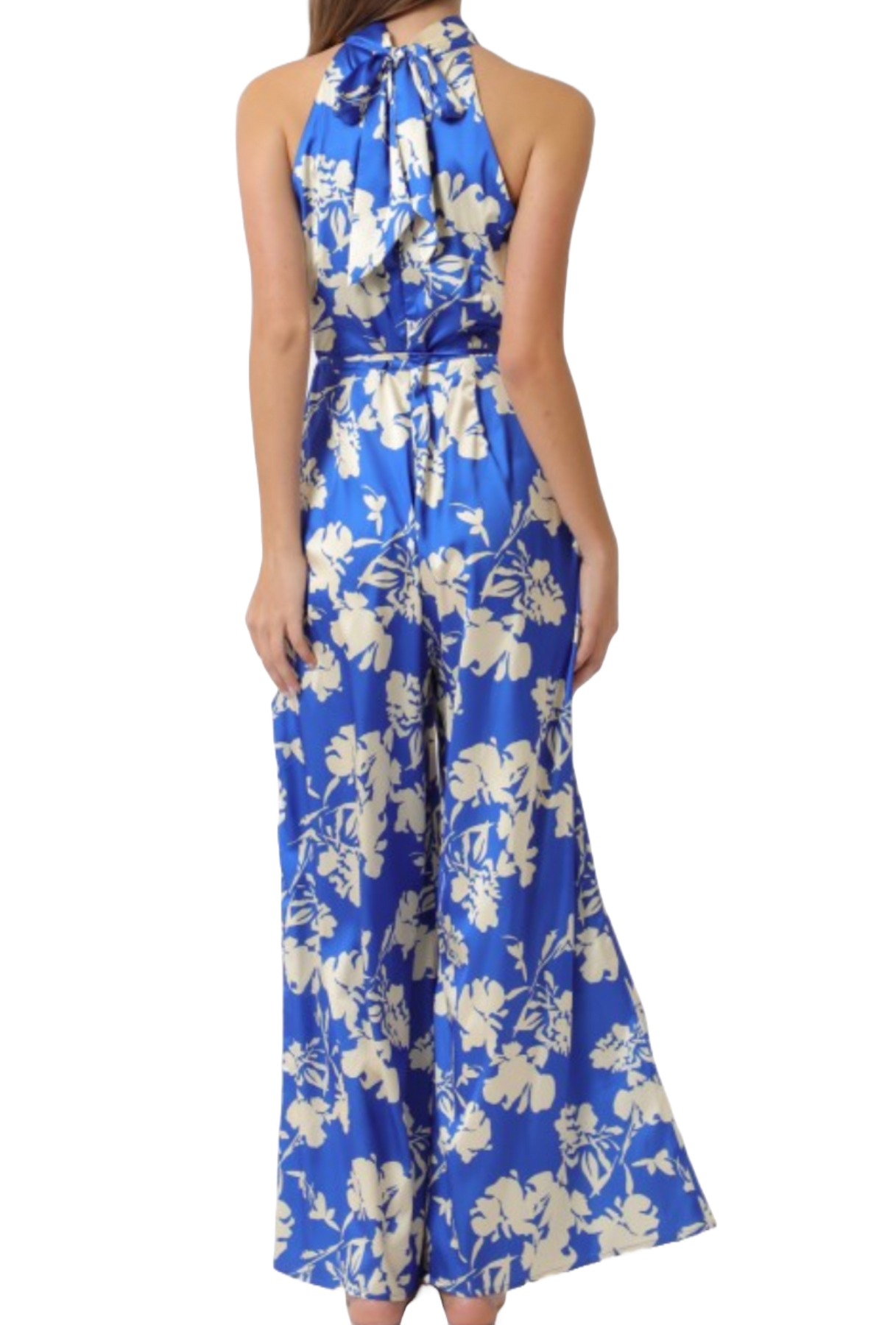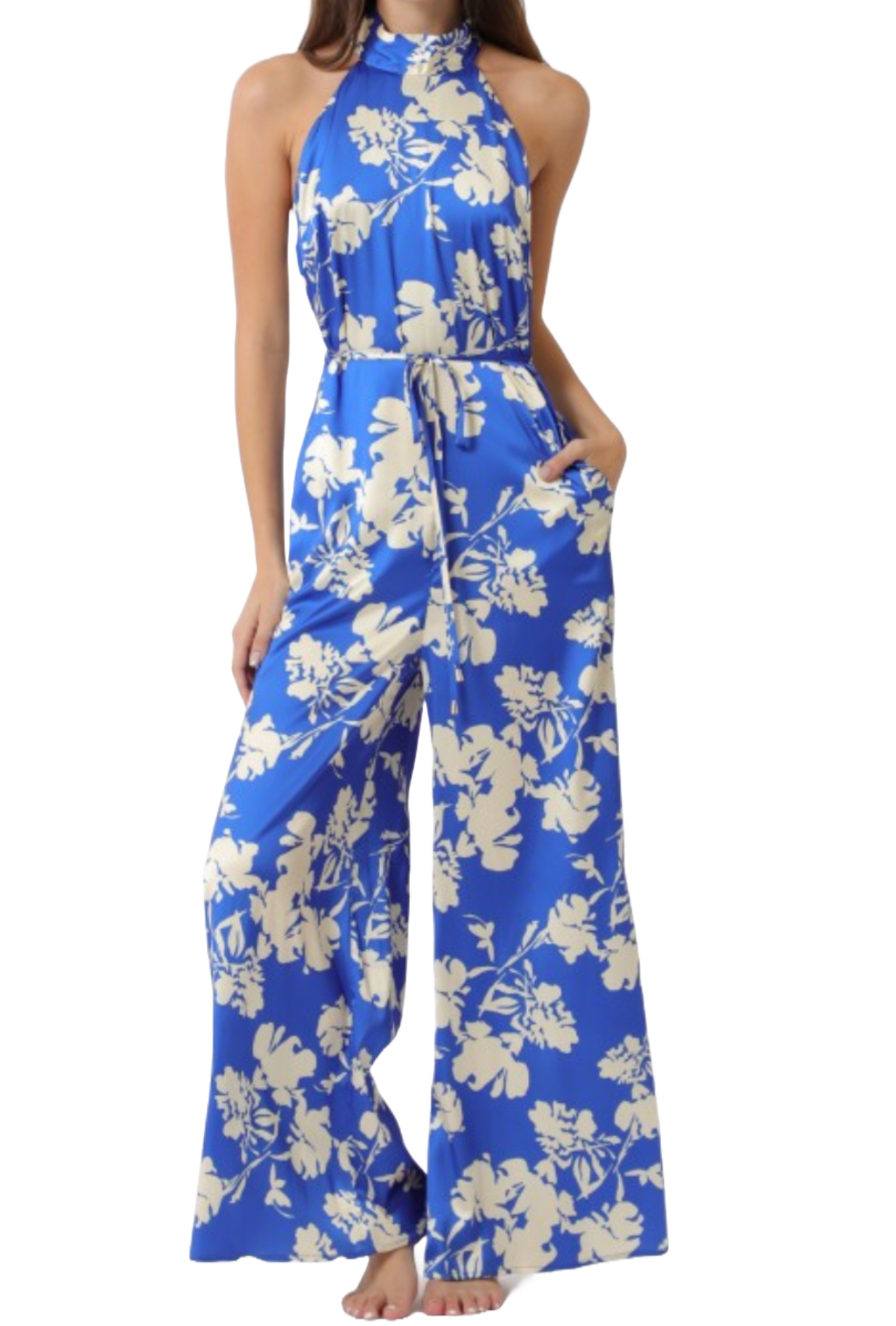 Statement-making halter jumpsuit featuring a bold floral print and flattering draped neckline. Designed with a self-tie back closure for an adjustable fit and a removable waist tie to define the silhouette. The wide leg shape creates effortless movement while side pockets add functional ease. Perfect for vacations, events, or any standout summer moment.