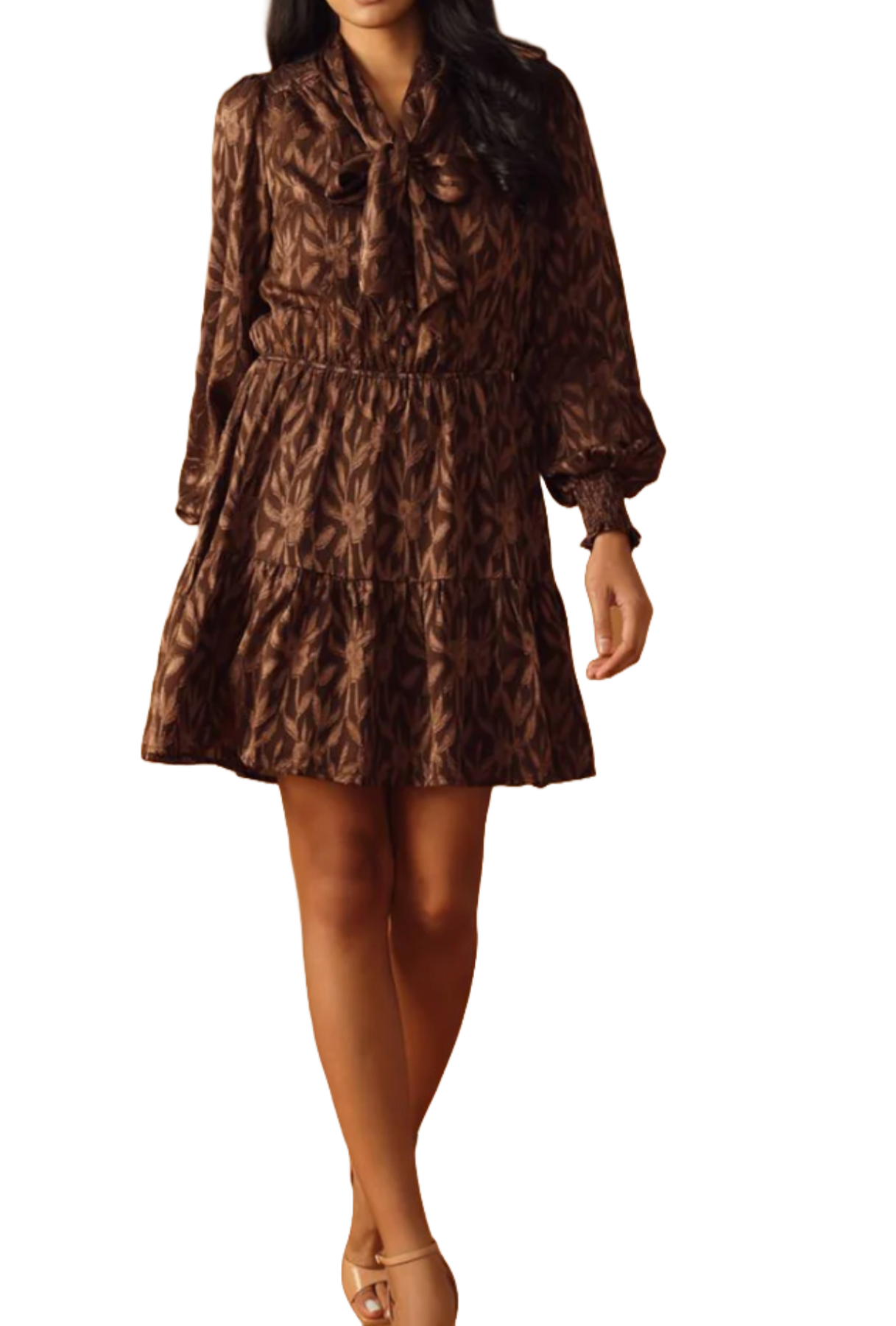 Textured woven mini dress featuring high neckline with front bow tie, long sleeve with smocked cuff, elasticized waist and ruffled hemline