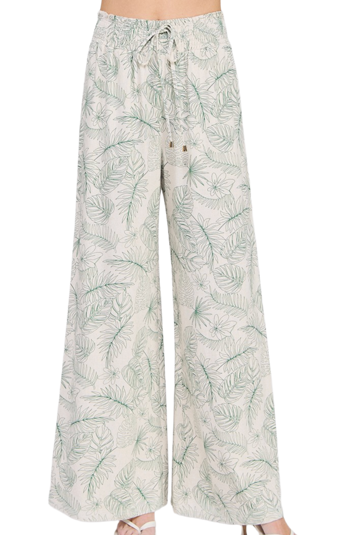 Effortless and breezy, these wide leg pants are made for easy, everyday wear. Designed with a relaxed silhouette and a soft, flowy feel, they feature an elastic waistband with an adjustable drawstring for the perfect fit. The subtle tropical-inspired print adds a fresh, laid-back vibe—perfect for pairing with simple tanks or lightweight knits for a chic, warm-weather look.