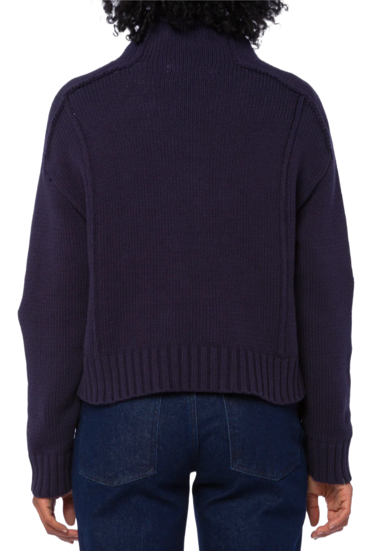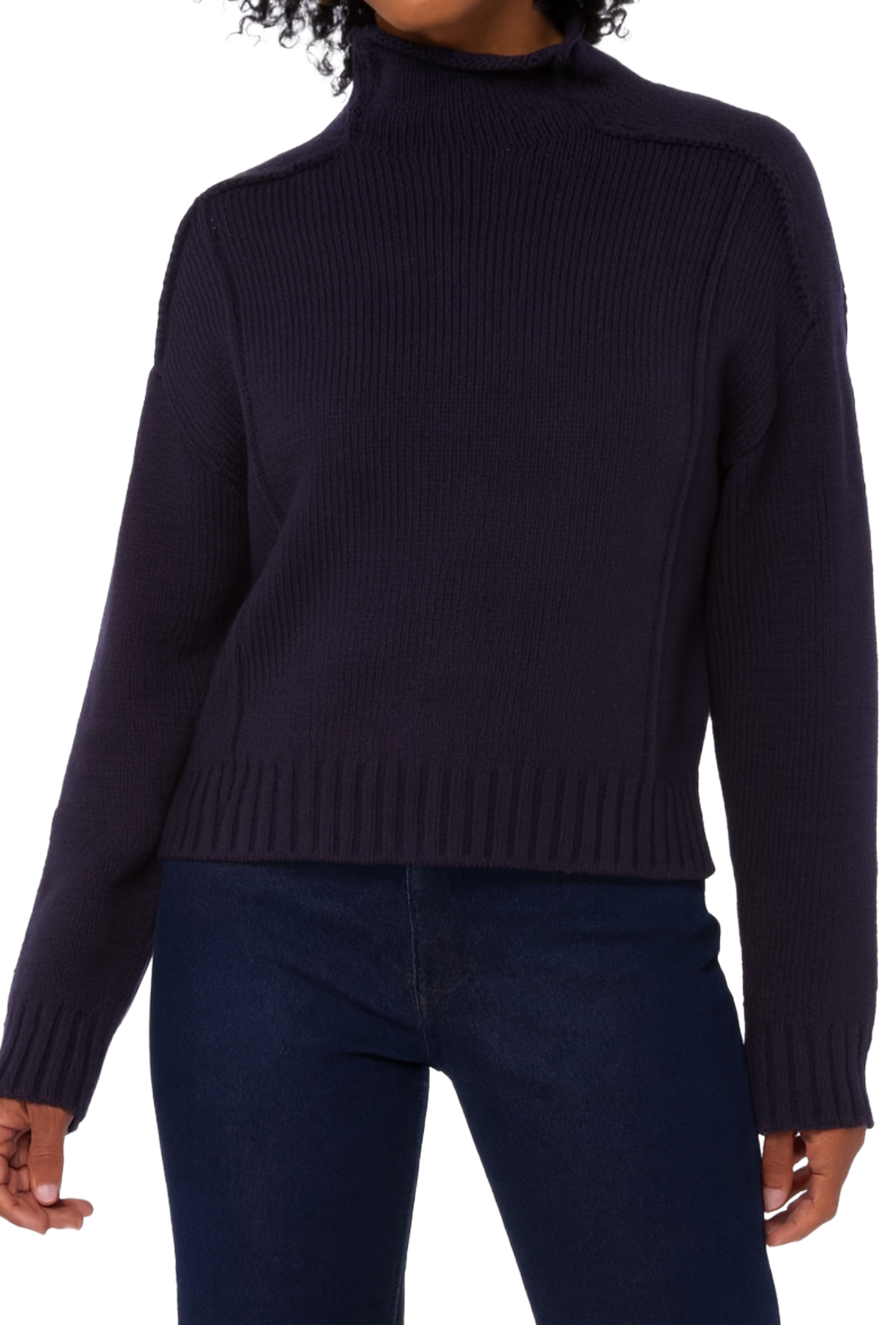 This long sleeve mock neck sweater features reverse seam detailing, and crafted from a soft, heavy-weight knit that offers a structured drape and textured feel.