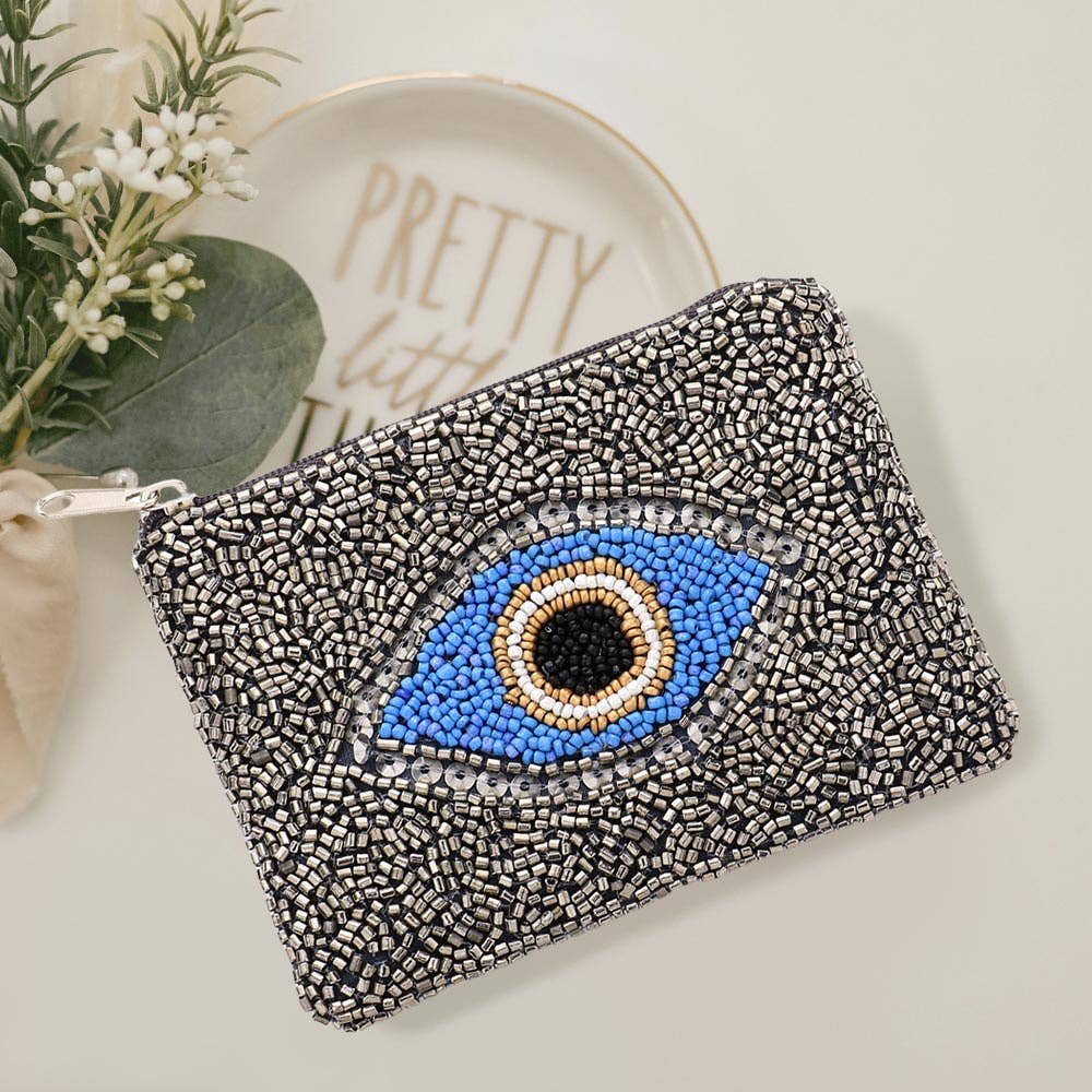 Mini pouch bag with hand-sewn seed beads and a striking evil eye motif. Compact and protective—perfect for coins, cards, or travel essentials. Ideal for gifting or spiritual accessory collections.