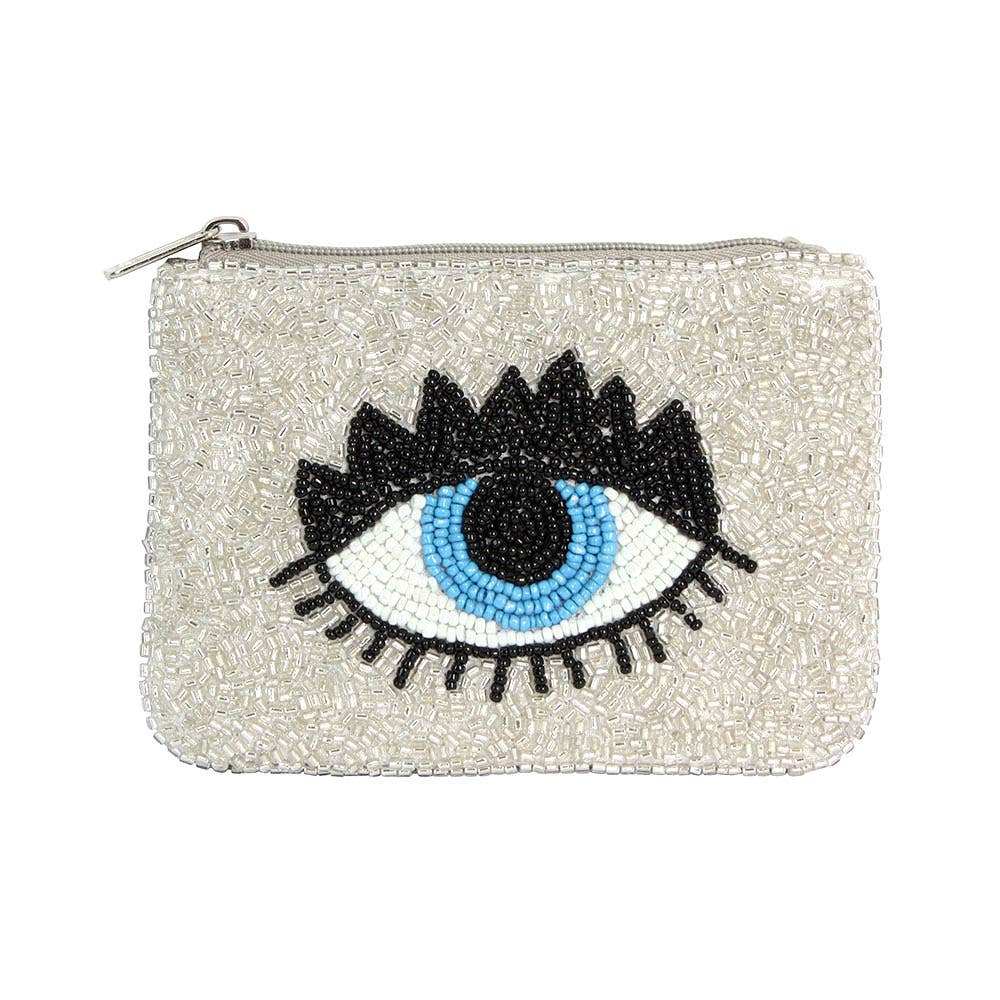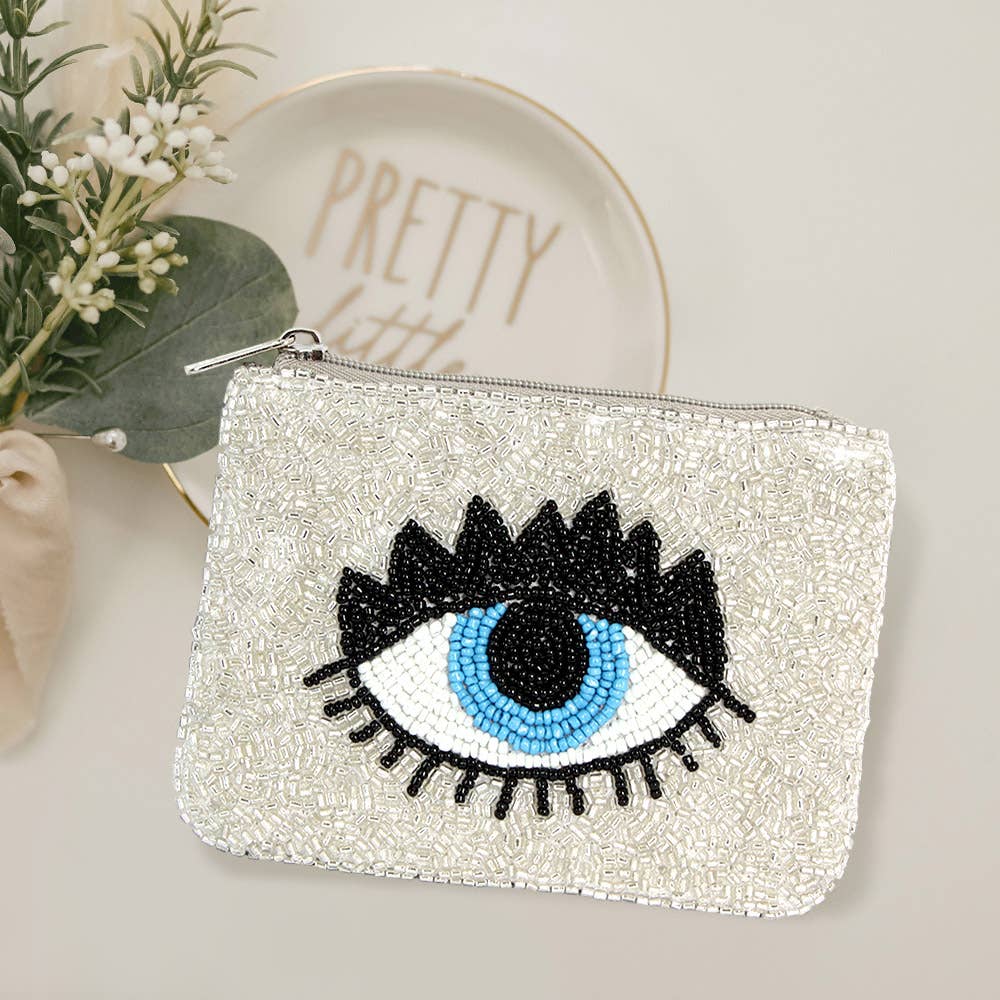Bag Size : 5.25" X 3.75" No Inside Pocket Zipper Closure Beads on Front Only Seed beaded mini pouch bag featuring a bold evil eye design. Handcrafted with intricate detailing—perfect as a coin purse, small clutch, or protective charm accessory. Great for gifting or everyday style.