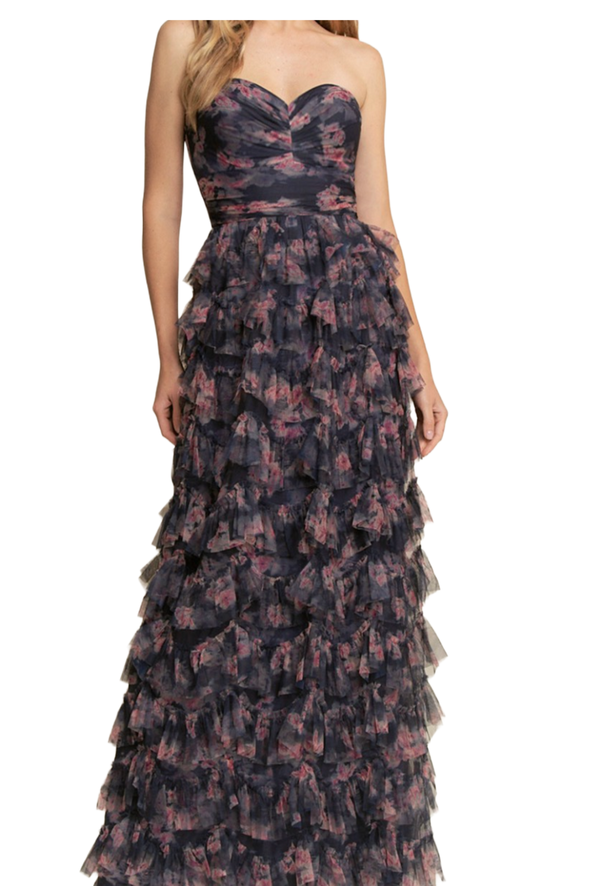 The deep midnight base with romantic floral detailing gives it that moody, modern elegance — perfect for black-tie weddings, galas, and unforgettable nights out. The tiered skirt adds movement and dimension, making every step feel like a moment.