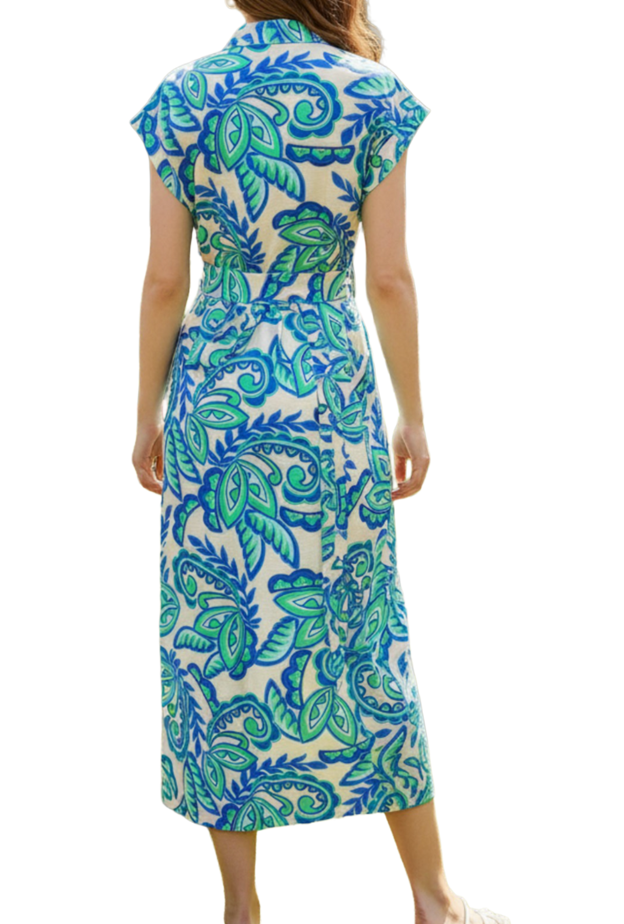 Vibrant and effortlessly refined, this blue and green paisley midi dress brings a fresh pop of color to your warm-weather wardrobe. Designed with a classic collared neckline and full button-front silhouette, it blends timeless tailoring with bold, statement-making print.