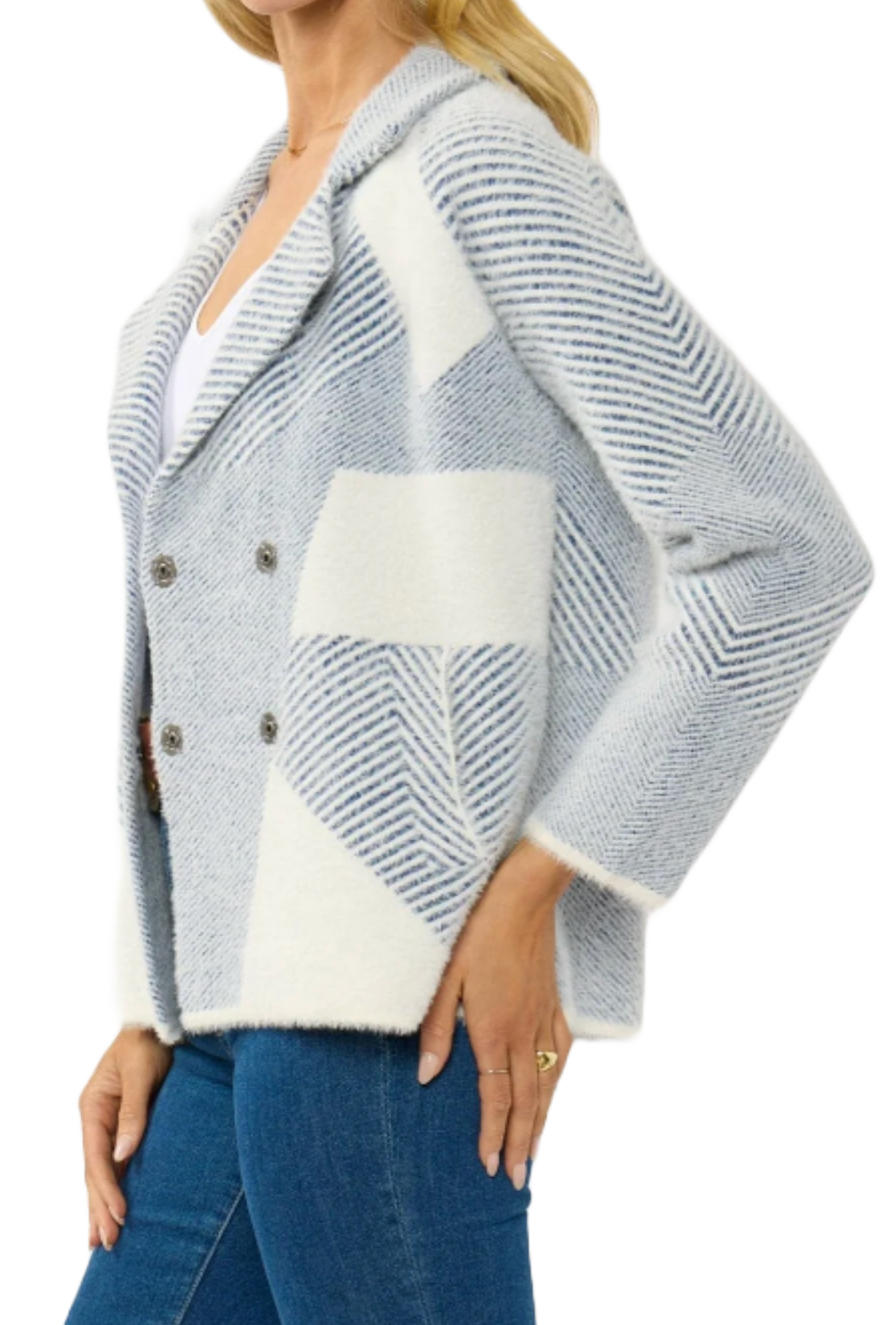 A soft, lightweight open-front jacket featuring a modern blue and ivory check pattern. Designed with a relaxed silhouette, notched collar, and long sleeves for an easy, polished layer. The textured knit gives it a cozy feel while remaining breathable, making it perfect for transitional seasons and effortless everyday styling.