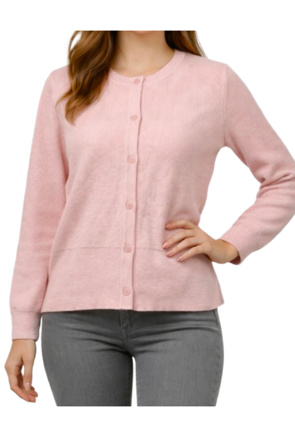 A timeless staple with a feminine touch. This lightweight knit cardigan features a classic round neckline, full button-front closure, and a flattering, easy fit. The soft blush tone makes it perfect for layering over dresses, pairing with denim, or styling for the office.