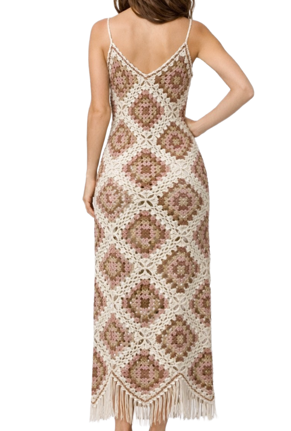 A true statement piece for vacation and summer events. This fitted maxi dress features an intricate granny-square inspired crochet pattern in soft neutral, blush, and earthy tones. Designed with delicate spaghetti straps and a flattering V-neckline, it hugs in all the right places while keeping a breezy, lightweight feel.