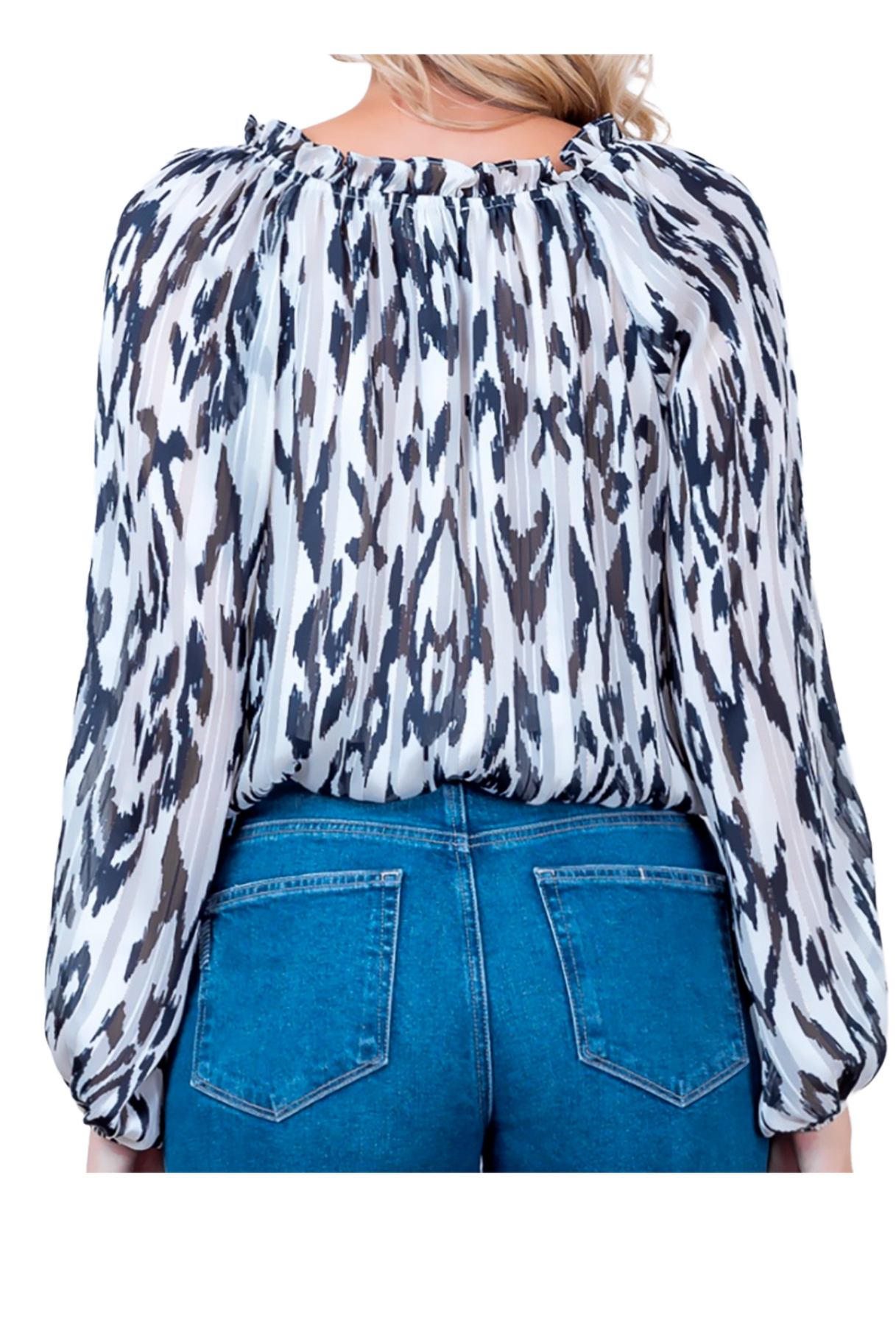 Chic and effortlessly elevated, this printed blouse features a soft V-neckline with subtle ruffle detailing and adjustable tie accents. Designed with a relaxed, flowy silhouette, it drapes beautifully for an easy, flattering fit. The long sleeves are finished with gentle volume and elastic cuffs, adding a touch of femininity to this modern abstract print top—perfect for dressing up denim or pairing with tailored pieces