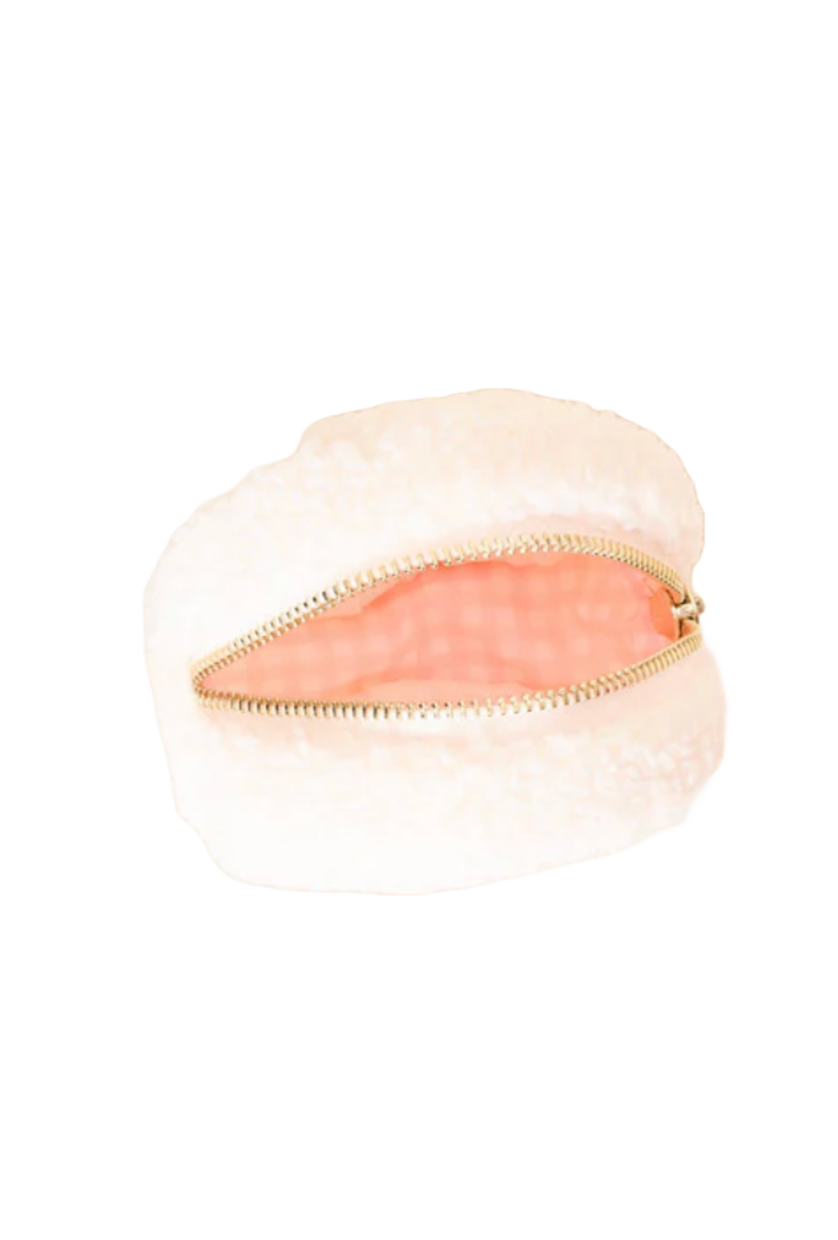 Add a festive touch to your everyday routine with our Christmas Circle Teddy Pouches. Made from soft sherpa material with adorable holiday details, it features a darling, wipeable lining inside and gold hardware. Pair your circle teddy pouch with our matching rectangle teddy pouches! Perfect for merchandising products together! Circle size: 4.5" dia, 2"