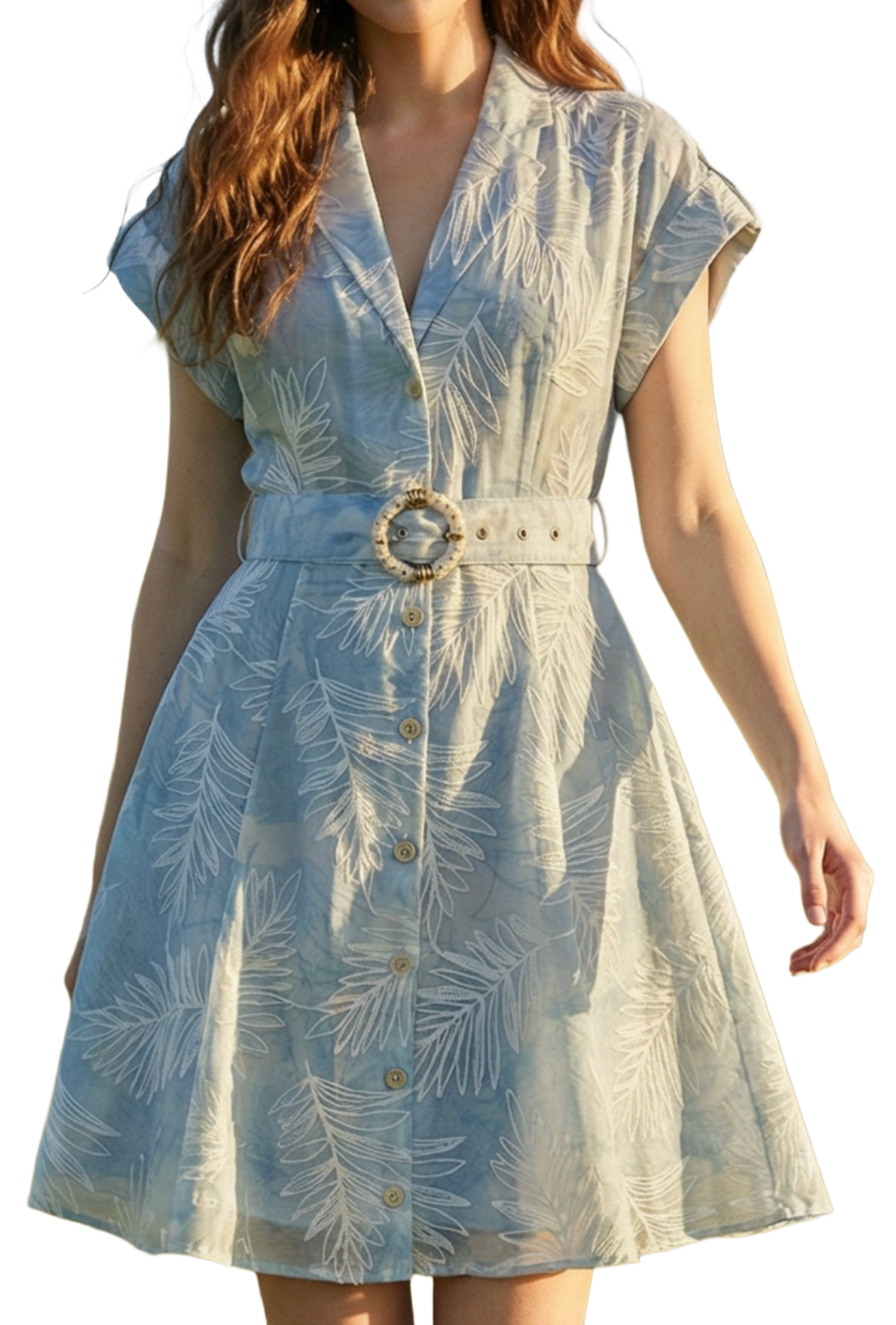 Light, airy, and effortlessly feminine, this soft blue mini dress features a subtle palm-inspired print for a breezy resort feel. The flattering button-front silhouette is complemented by a structured collar and relaxed cap sleeves for an easy yet polished look.