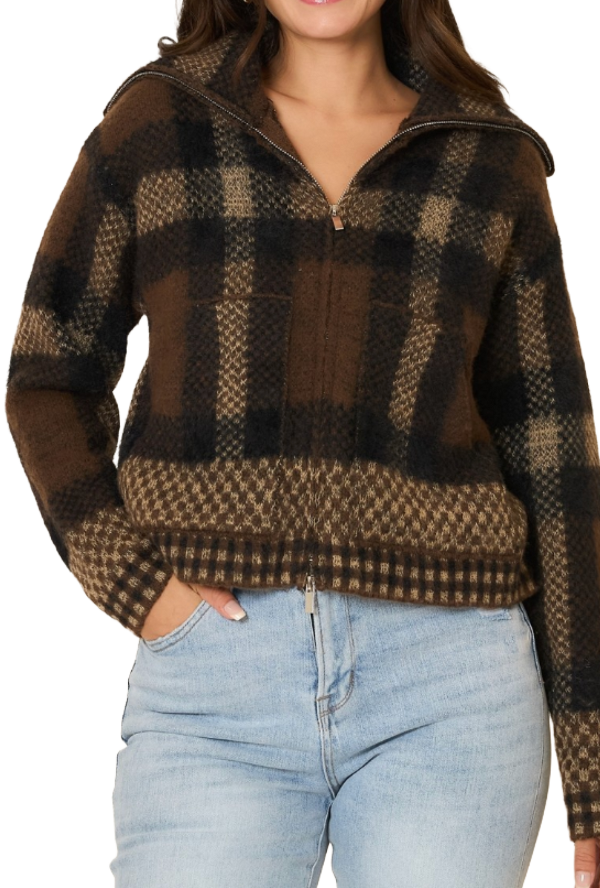 Plaid knit zipper jacket with patch pockets