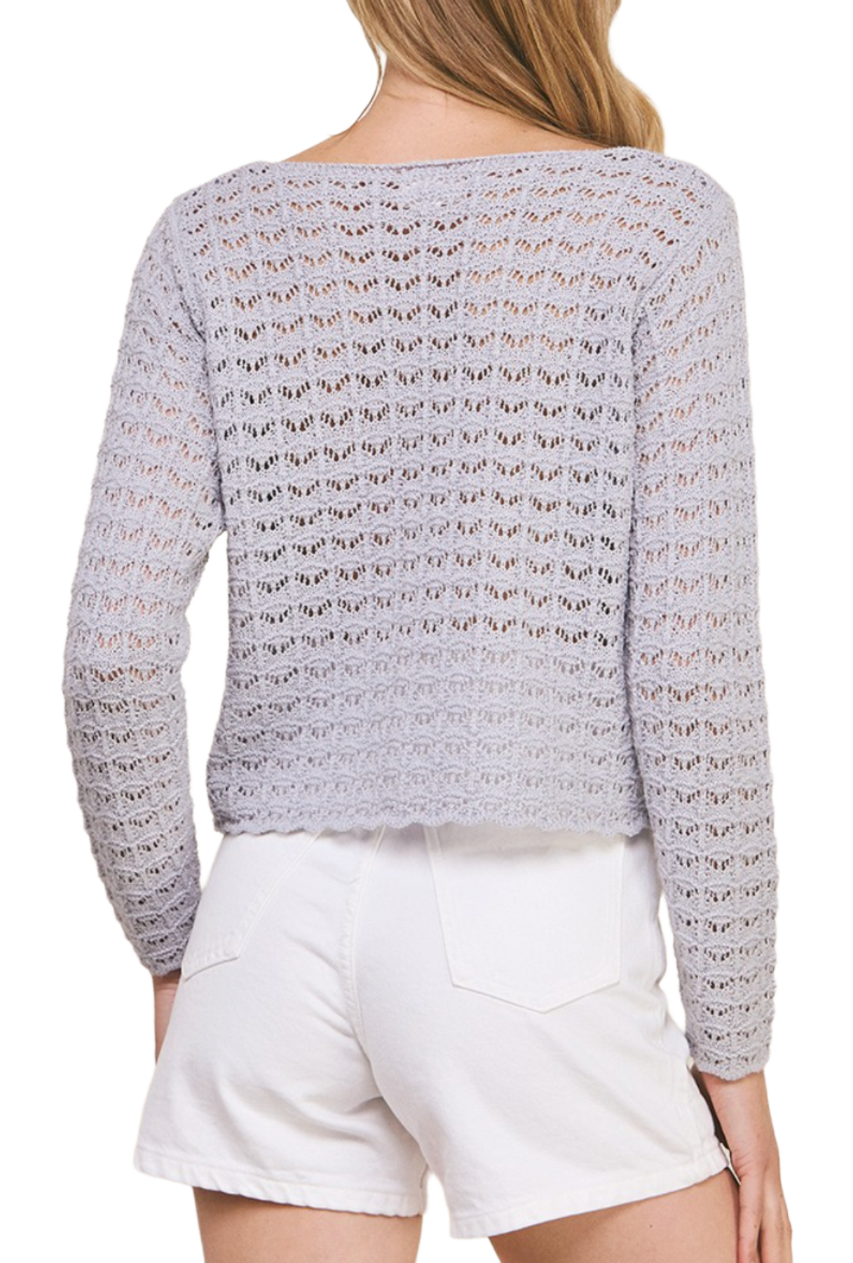 A lightweight knit sweater designed with a soft, airy open-stitch texture for an effortless, laid-back feel. Featuring a flattering scoop neckline and a slightly cropped silhouette, this piece is perfect for layering over tanks or bralettes. The delicate scalloped hem adds a feminine touch, making it an easy go-to for casual, everyday styling.