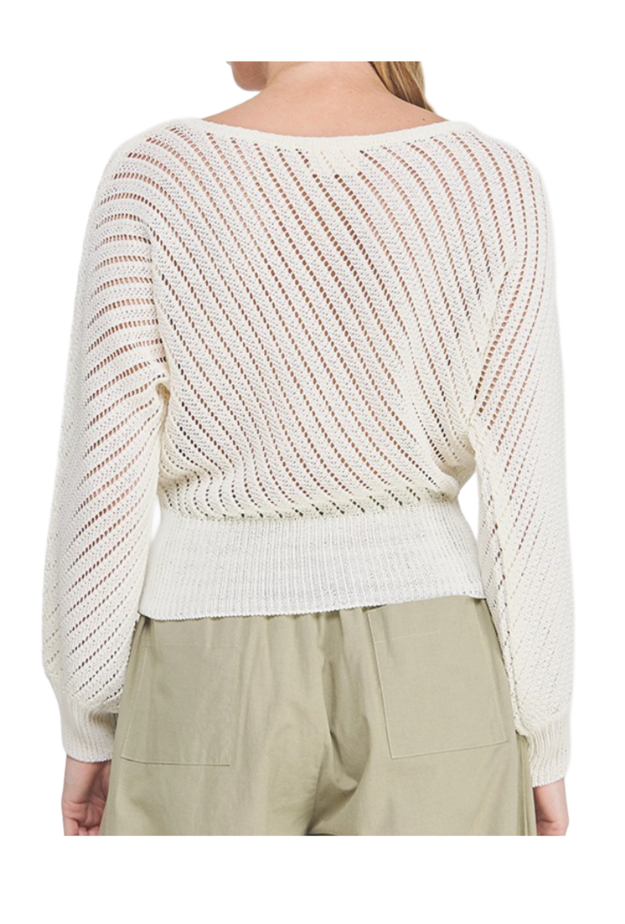 A lightweight knit designed with a modern, breathable open-stitch pattern for an effortlessly elevated look. Featuring a relaxed fit with subtle volume through the sleeves and a softly fitted hem, this sweater creates a flattering silhouette while staying comfortable. Perfect for layering over tanks or bralettes, it’s an easy go-to for transitional styling from season to season.