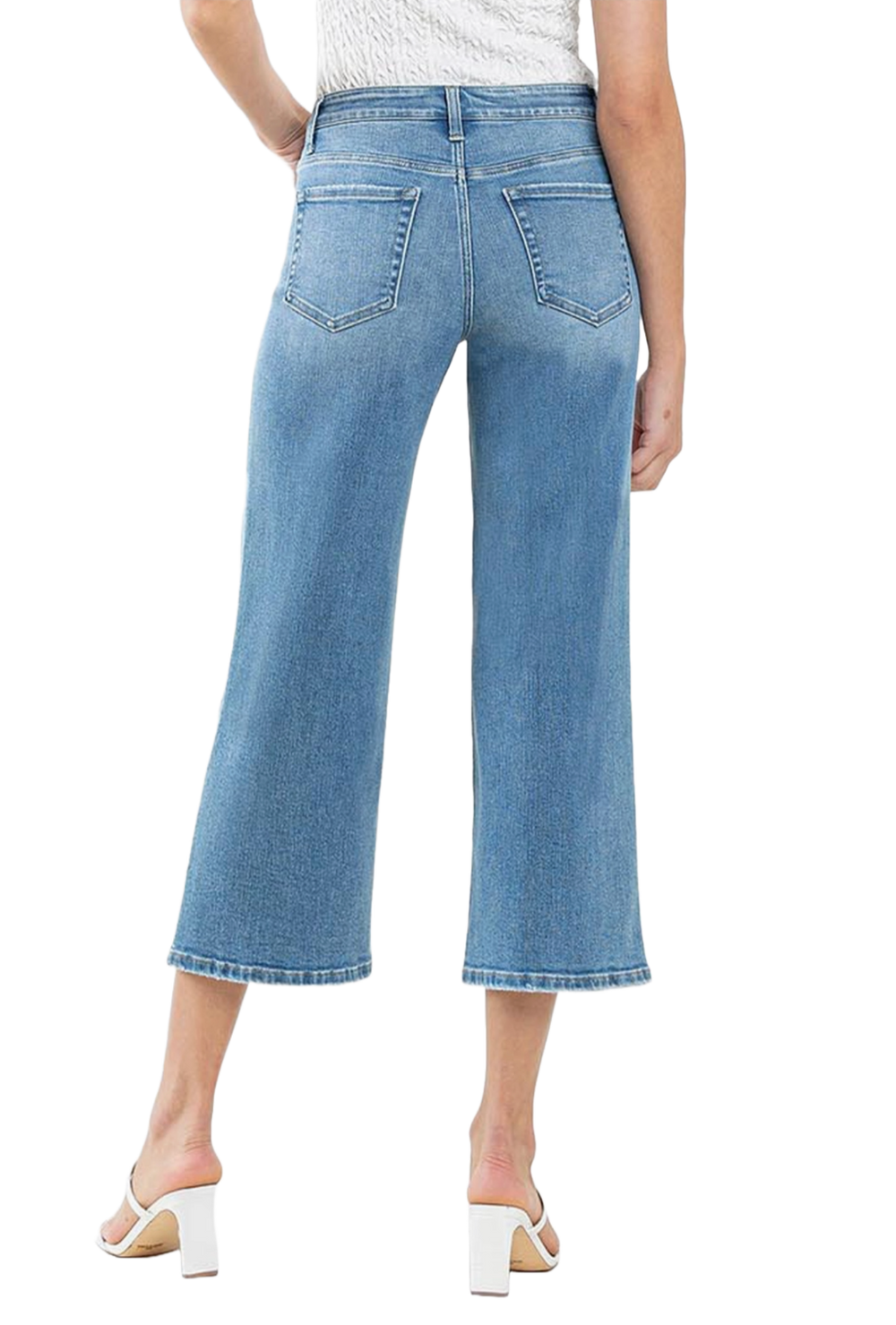 Comfort Stretch Denim, High Rise Waist, Raw Hem, Cropped Length, Wide Leg Jeans